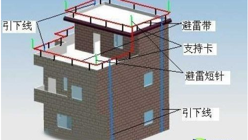防雷裝置的結構有三部,通常由接閃器、引下線和接地裝置三個部分組成。一般情況下,接閃器由避雷帶和避雷短針組成。接閃器敷設于樓頂天面,位于建筑物的高處,起到接閃雷電流的作用。引下線敷設于墻體外側,上聯接閃器,下聯接地裝置,起到將雷電流導入接地裝置的作用。接地裝置是埋于地下的部分,由水平接地體、垂直接地體和接地線組成,能降低防雷裝置的接地電阻,還能使雷電流均勻快速地向周圍大地擴散,降低跨步電壓。